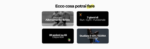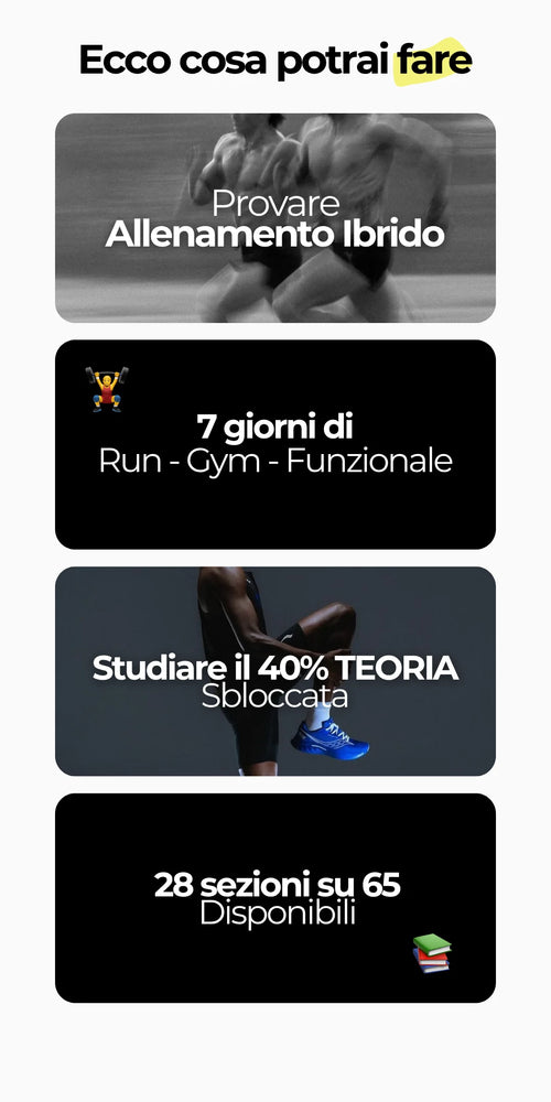 Accedi a circa il 40% della teoria del programma completo, e a 7 giorni di allenamenti ibridi. Considerando che il programma completo ha circa 65 sezioni, in questa versione gratuita potrai visualizzarne circa 26. È pensato per darti una panoramica realistica del metodo.